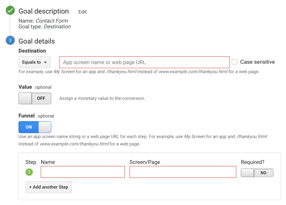 Destination goals are perfect for tracking thank-you pages and confirmation pages. They can be used to discover the end page your user reaches after completing as specific action. For example, if you have a contact form to be filled out, you could set the destination goal to the thank-you page URL which appears afterwards, as this indicates that the user has completed the form, as opposed to just visited the page.