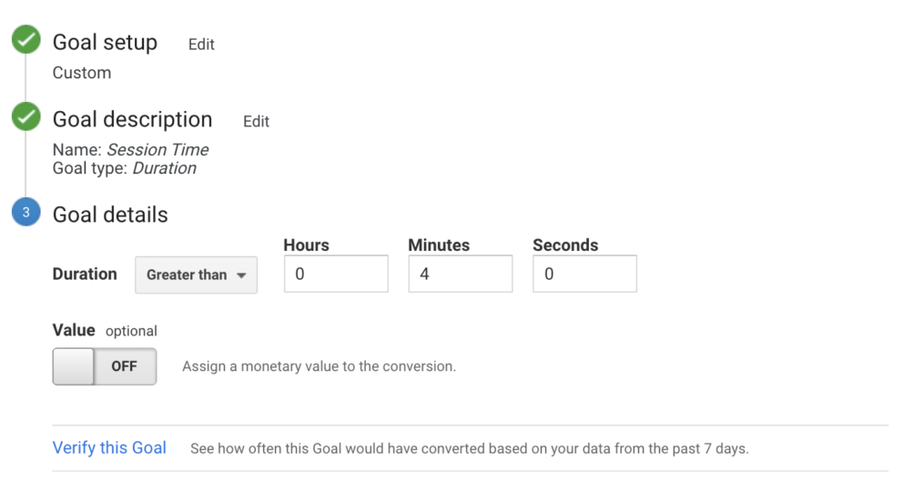 Duration goals are effective if you want to track how long your users spend on a certain page. They are so quick to set up; all you need to do is choose ‘greater than’ and enter the amount of time you want to count as a conversion. Average session time is around 3 minutes, so we have chosen 4 just to track how many users are really engaged!