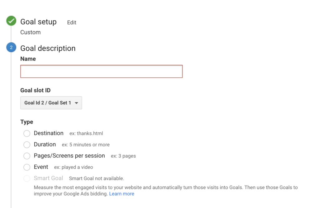 Once you have signed in to your Google Analytics account, select Admin > View > Goals > + NEW GOAL > Custom. Then simply chose a name and find an empty Goal Slot ID.