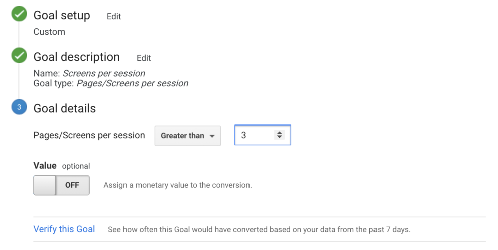 Page/screens goals allow you to see how many pages your users view in a session. This is a great way to measure how engaged your visitors are, and they are so easy to set up. All you have to do is name your goal and select however many pages you would like to count as a conversion (we normally go for 3!). Then simply save your goal and any time a user browses more than 3 pages, it will track as a conversion!