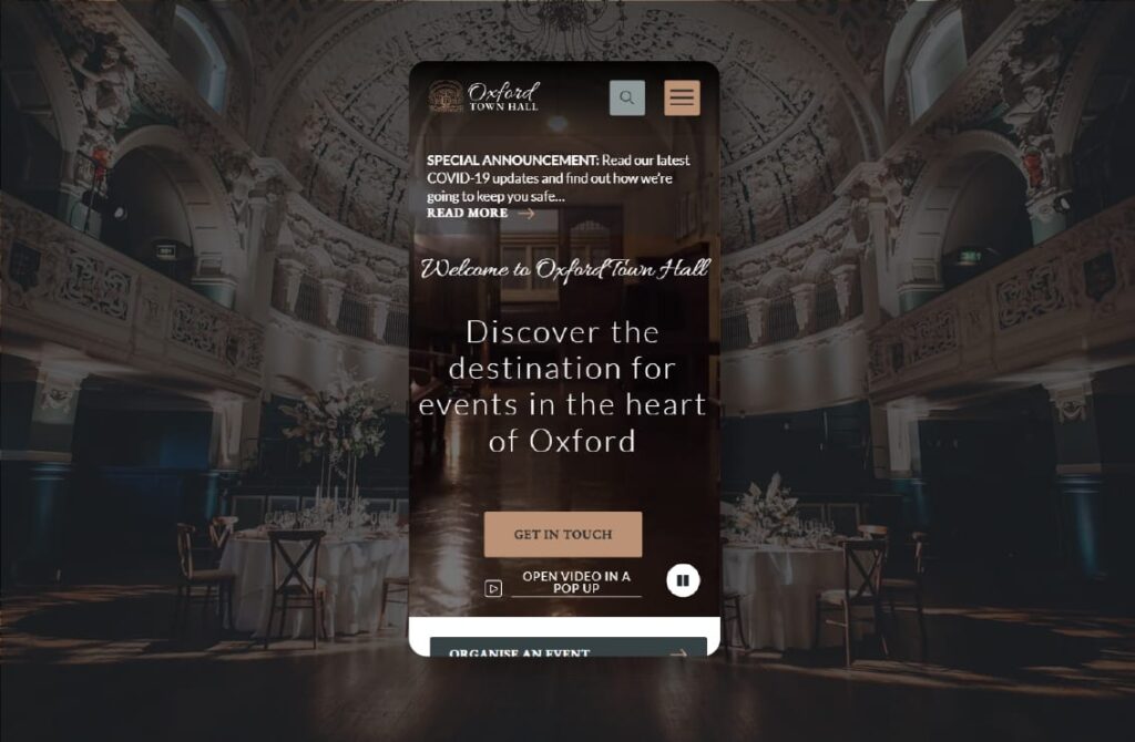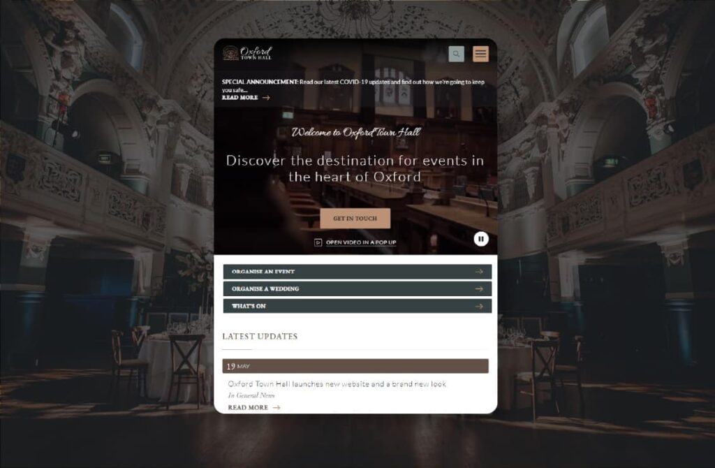 Accessibility was embedded throughout the build, including screen-reader compatibility, readable colour contrasts, alt text for imagery and full keyboard navigation. The result is a visually striking, fully accessible website that positions Oxford Town Hall as one of Oxford’s leading event venues and supports ongoing growth through SEO consultancy and digital marketing.